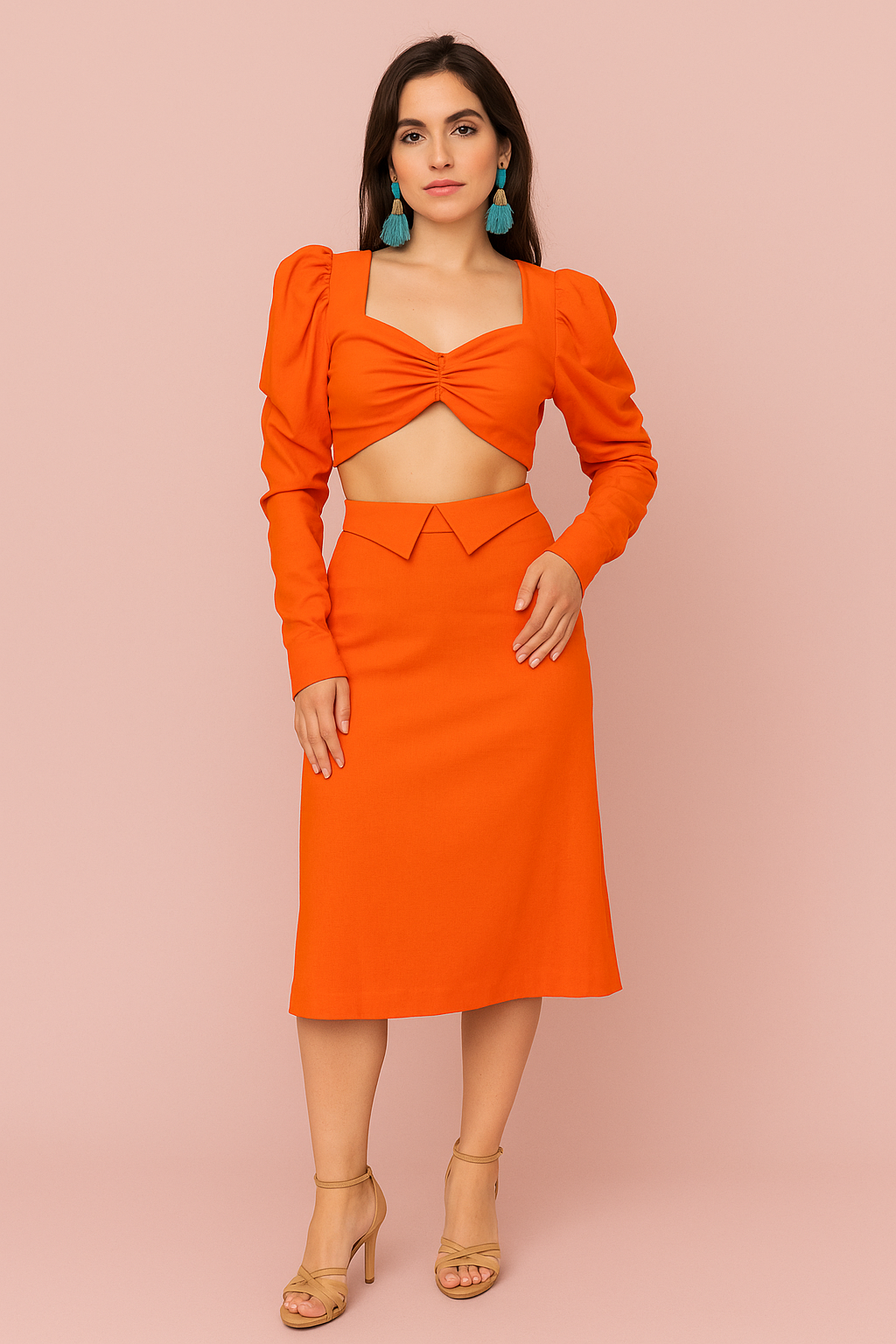 Make a bold statement with the Alexandra orange linen crop top featuring long sleeves. Designed for those who embrace fearless fashion, this vibrant piece combines breathable linen fabric with a cropped silhouette that highlights your confidence. The long sleeves balance the daring cut, adding an unexpected twist of elegance and edge. Perfect for turning heads at any occasion, the striking orange hue ensures you stand out in the crowd while staying comfortable and stylish. Own your look with this fearless, vibrant crop top that challenges the ordinary.