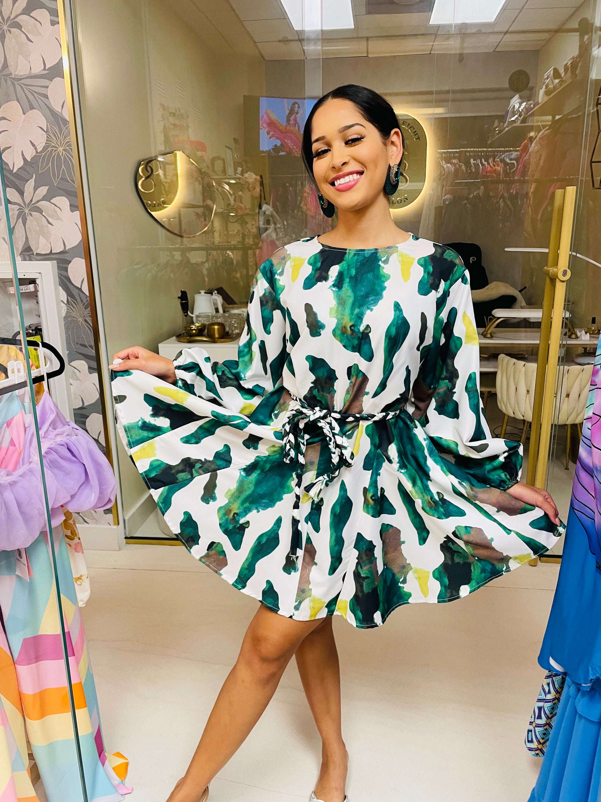 The Ellie Dress in Green Animal Print is a daring and versatile statement piece perfect for any occasion. Combining flirty charm with bold sophistication, the long sleeves and A-line silhouette create a beautiful volume at the bottom that elegantly showcases your legs. Whether worn with or without the sash, this dress transforms effortlessly to suit your mood and style, offering multiple looks in one. Its striking animal print in vibrant green adds a fearless edge, making the Ellie dress a go-to choice for those who want to exude confidence and playful elegance wherever they go.