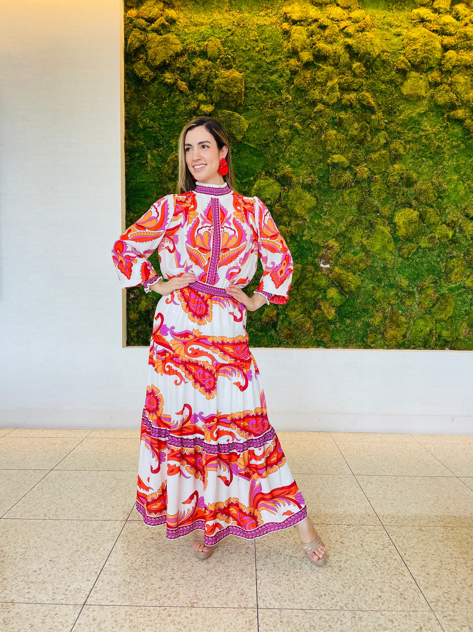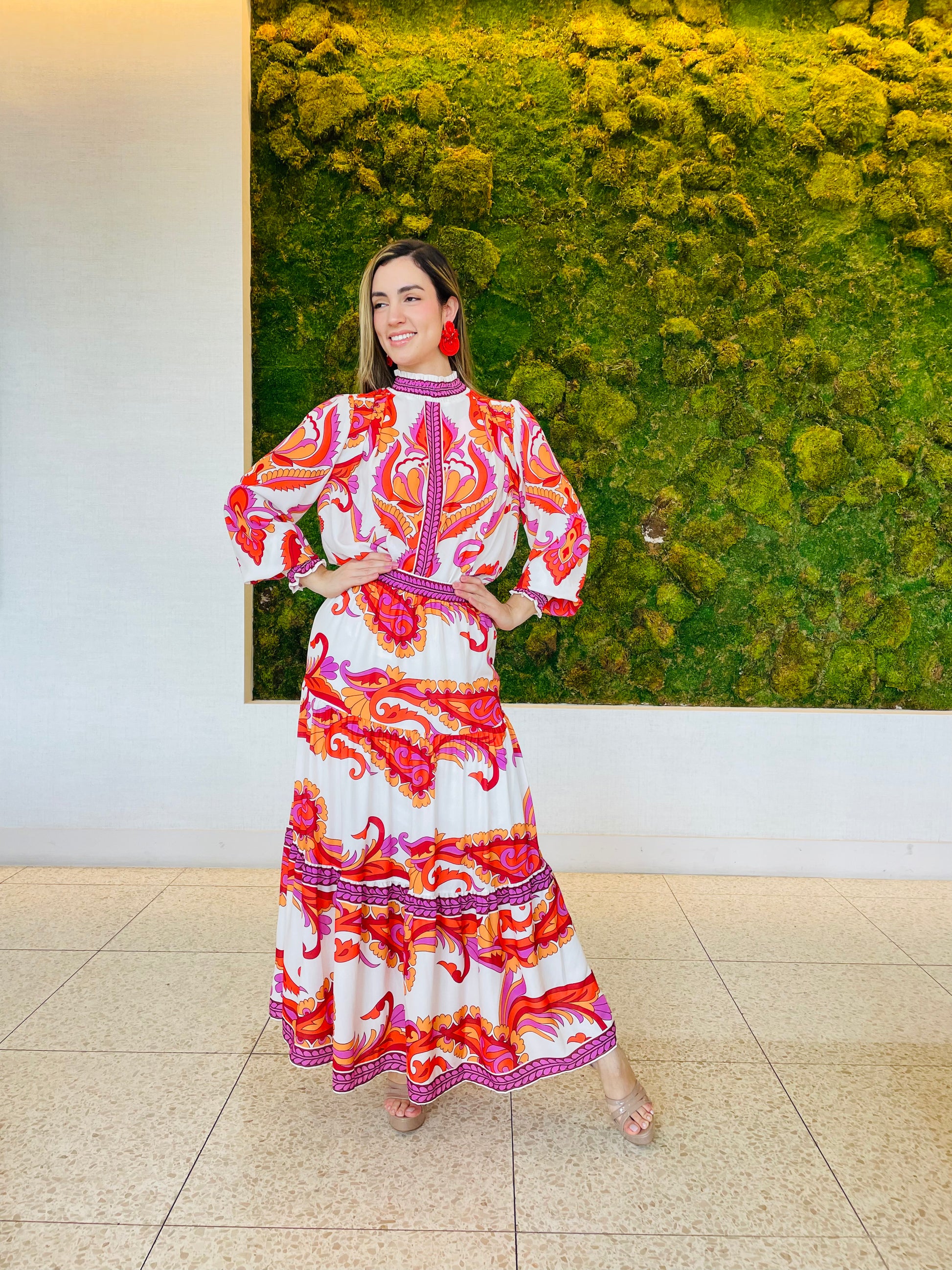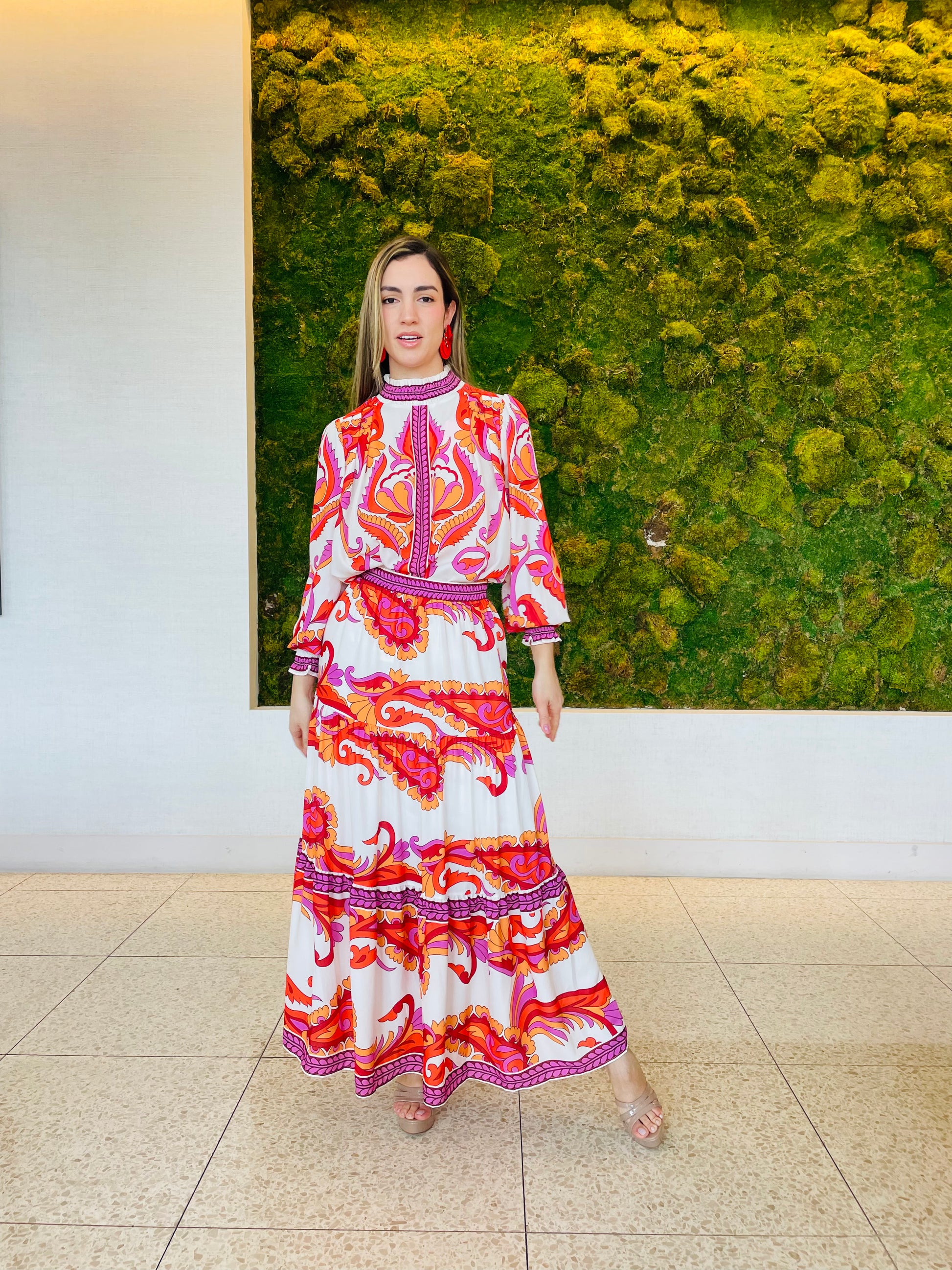 Elevate your wardrobe with this daring maxi skirt featuring a bold orange and off-white paisley print on lightweight chiffon. Its flowing silhouette moves effortlessly with your every step, adding an air of confidence and elegance. Perfect for making a statement at any event, this skirt blends vibrant colors with delicate fabric to create a look that’s both striking and sophisticated. Whether paired with a simple top or layered for a bohemian vibe, it’s designed to turn heads and showcase your fearless style.