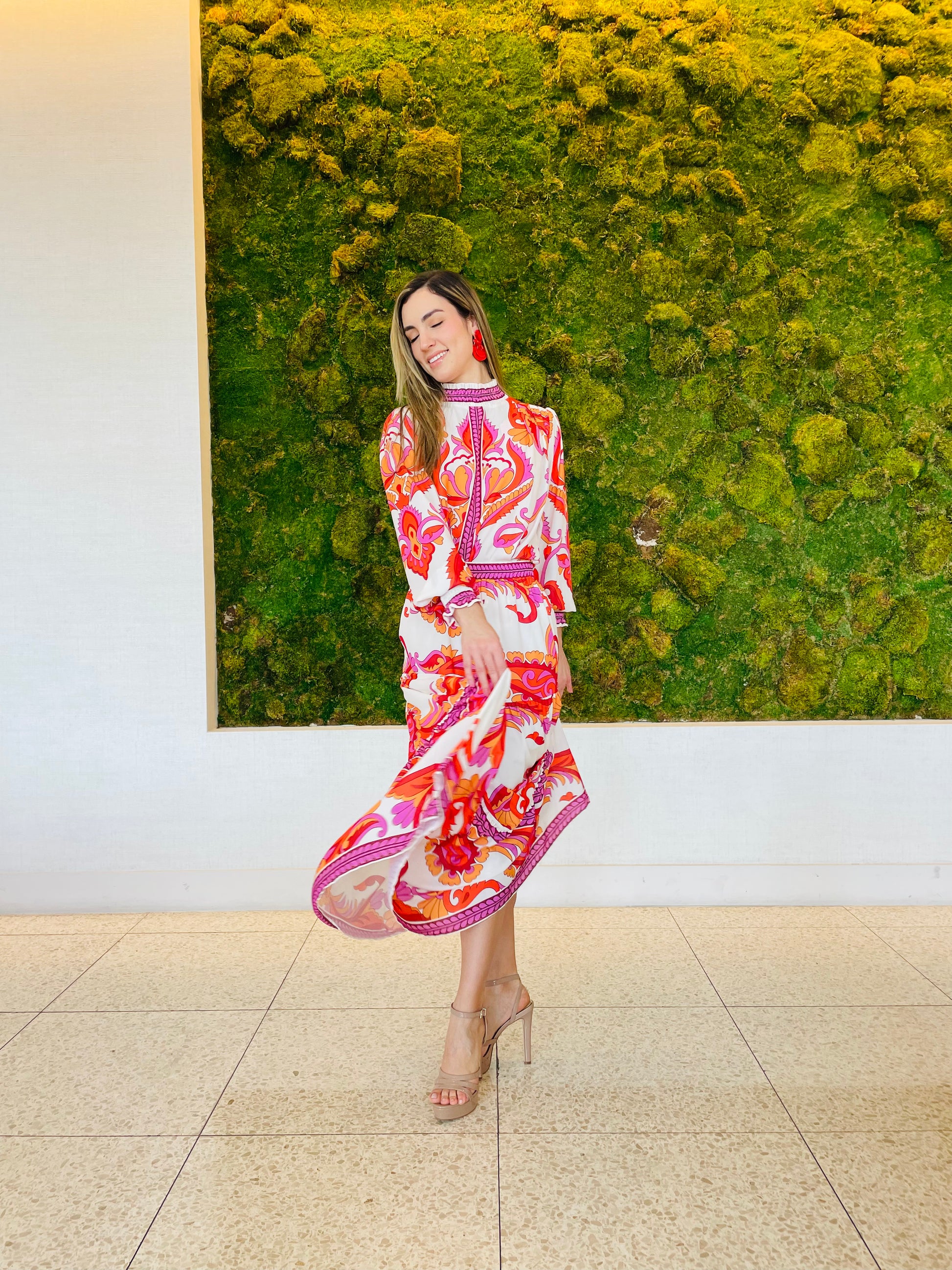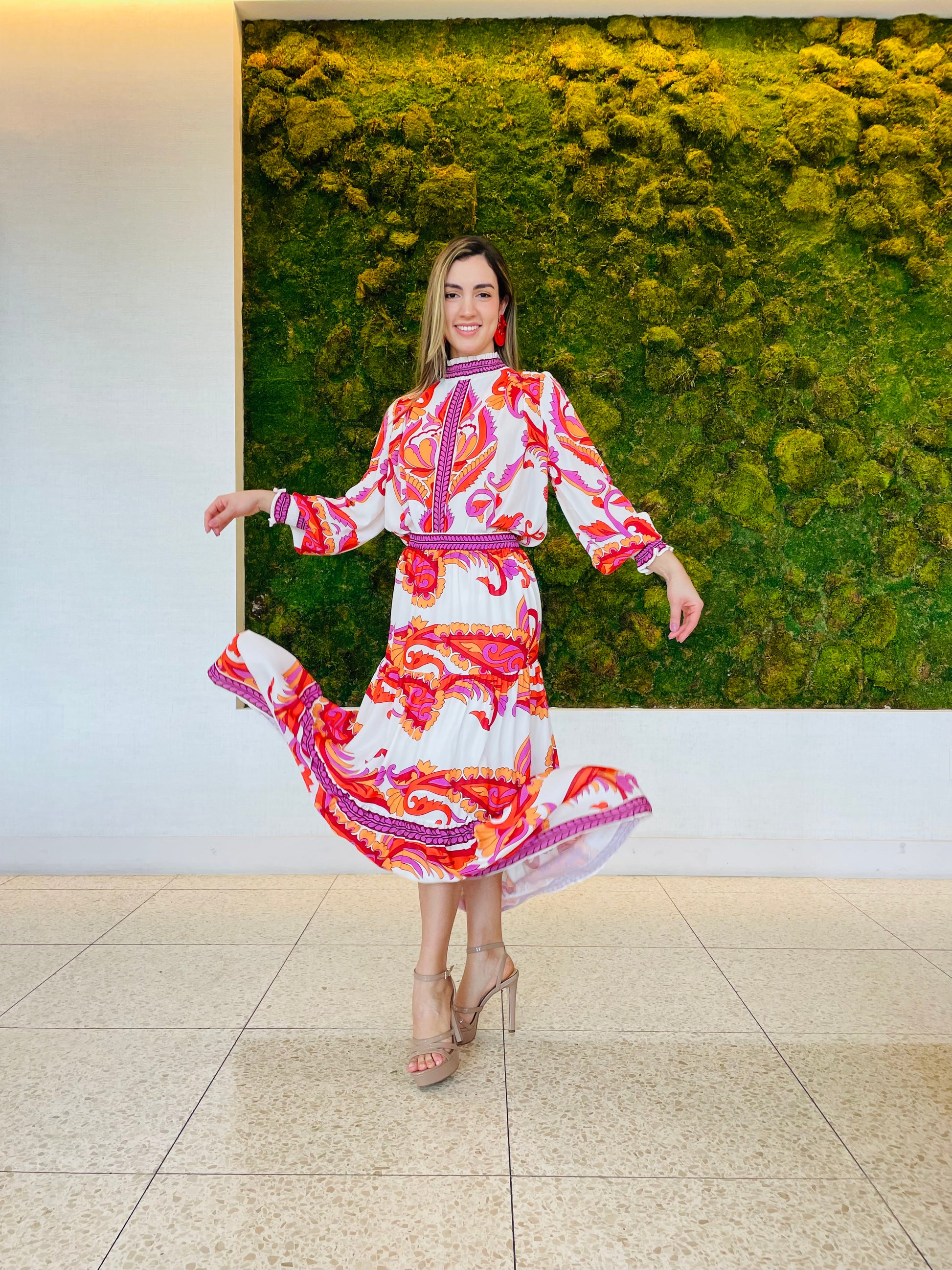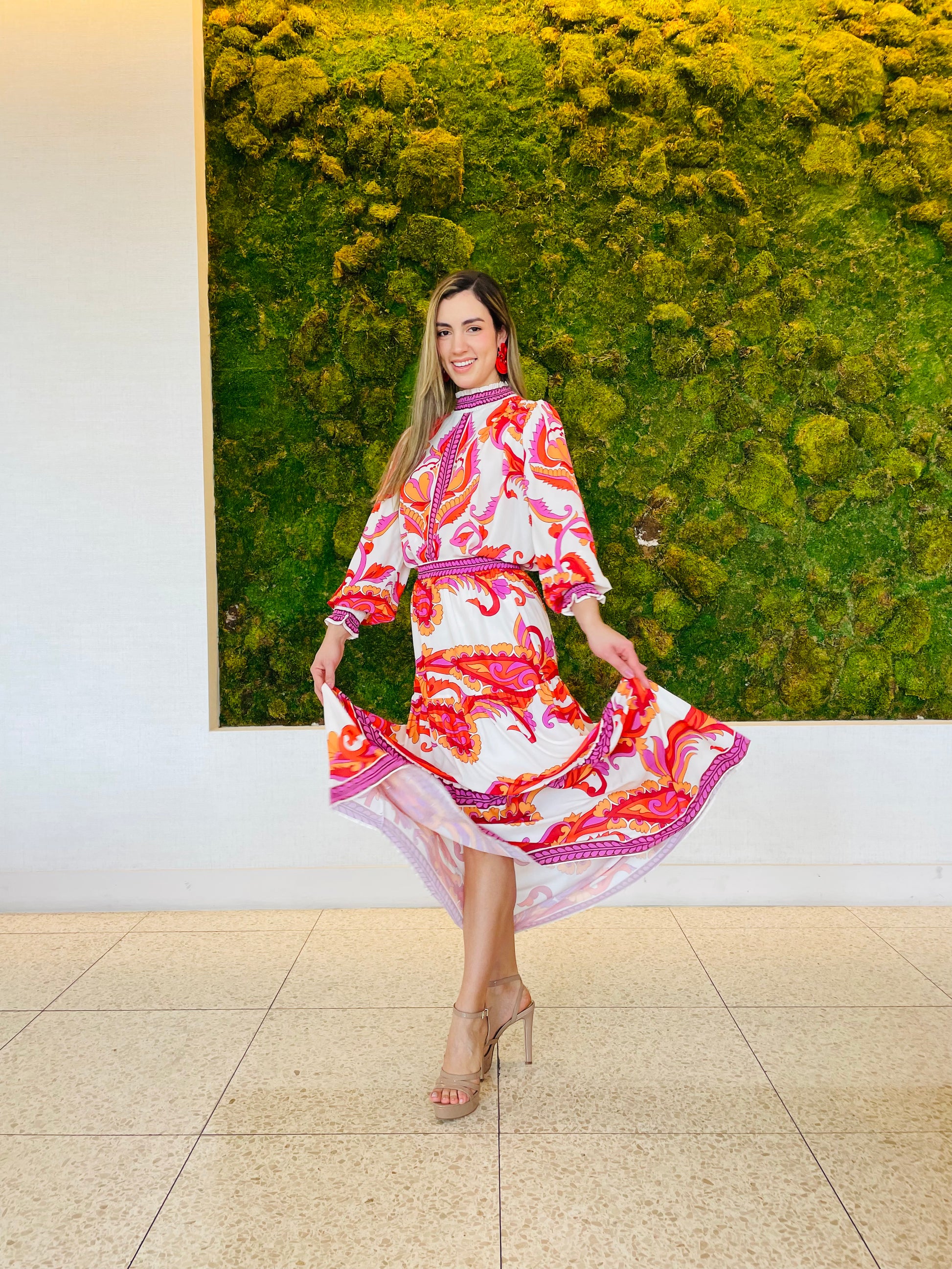 Elevate your wardrobe with this daring maxi skirt featuring a bold orange and off-white paisley print on lightweight chiffon. Its flowing silhouette moves effortlessly with your every step, adding an air of confidence and elegance. Perfect for making a statement at any event, this skirt blends vibrant colors with delicate fabric to create a look that’s both striking and sophisticated. Whether paired with a simple top or layered for a bohemian vibe, it’s designed to turn heads and showcase your fearless style.