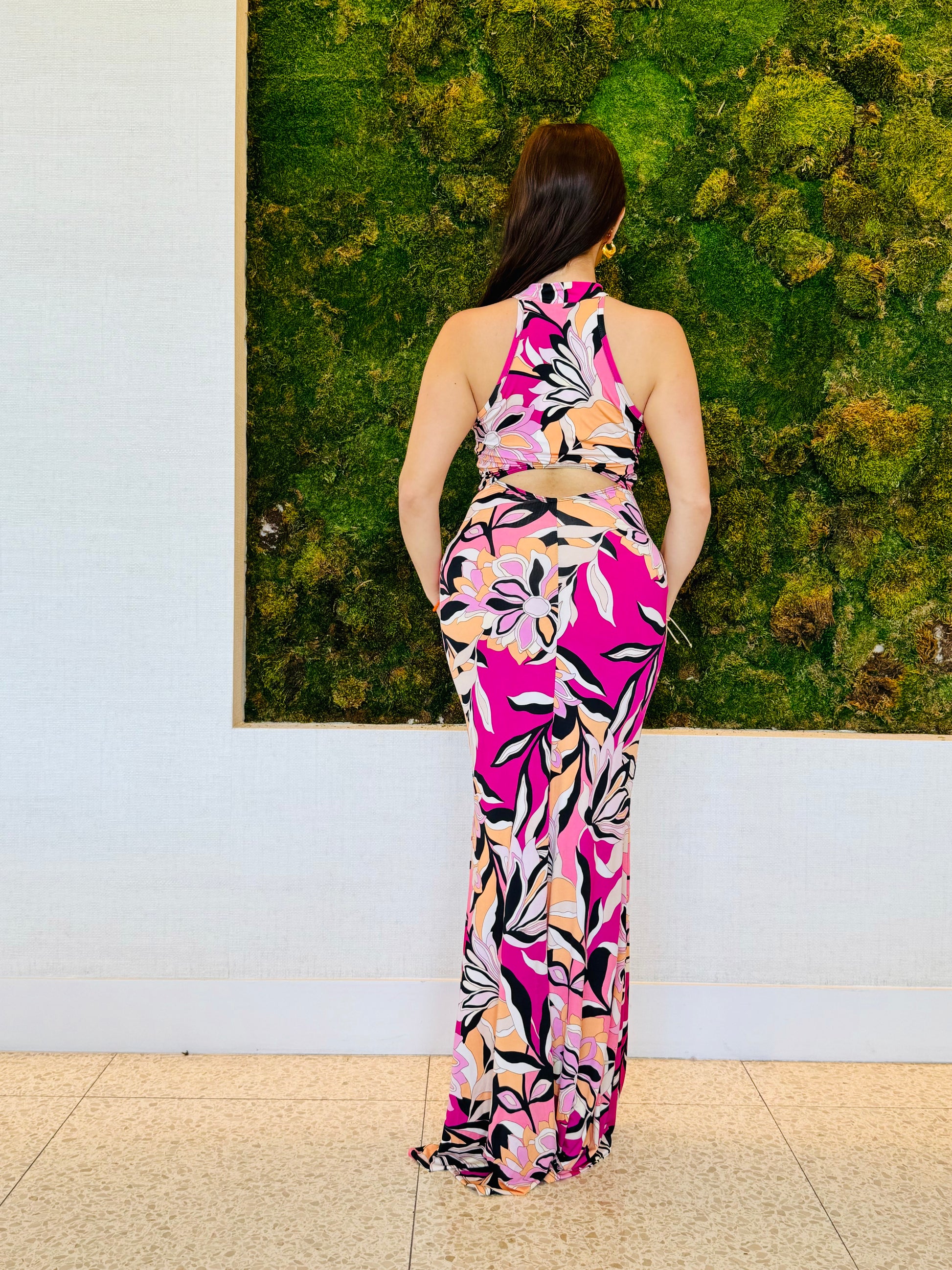 The Eva maxi dress features a striking black and magenta print, combining bold colors with elegant design. Its peek-a-boo back detail adds a subtle yet alluring touch, elevating the overall sophistication of the dress. Flowing to a flattering maxi length, this dress creates a graceful silhouette that moves beautifully with every step. Perfect for upscale events or stylish evenings, Eva blends modern accents with timeless refinement, making it a standout piece for any sophisticated wardrobe.