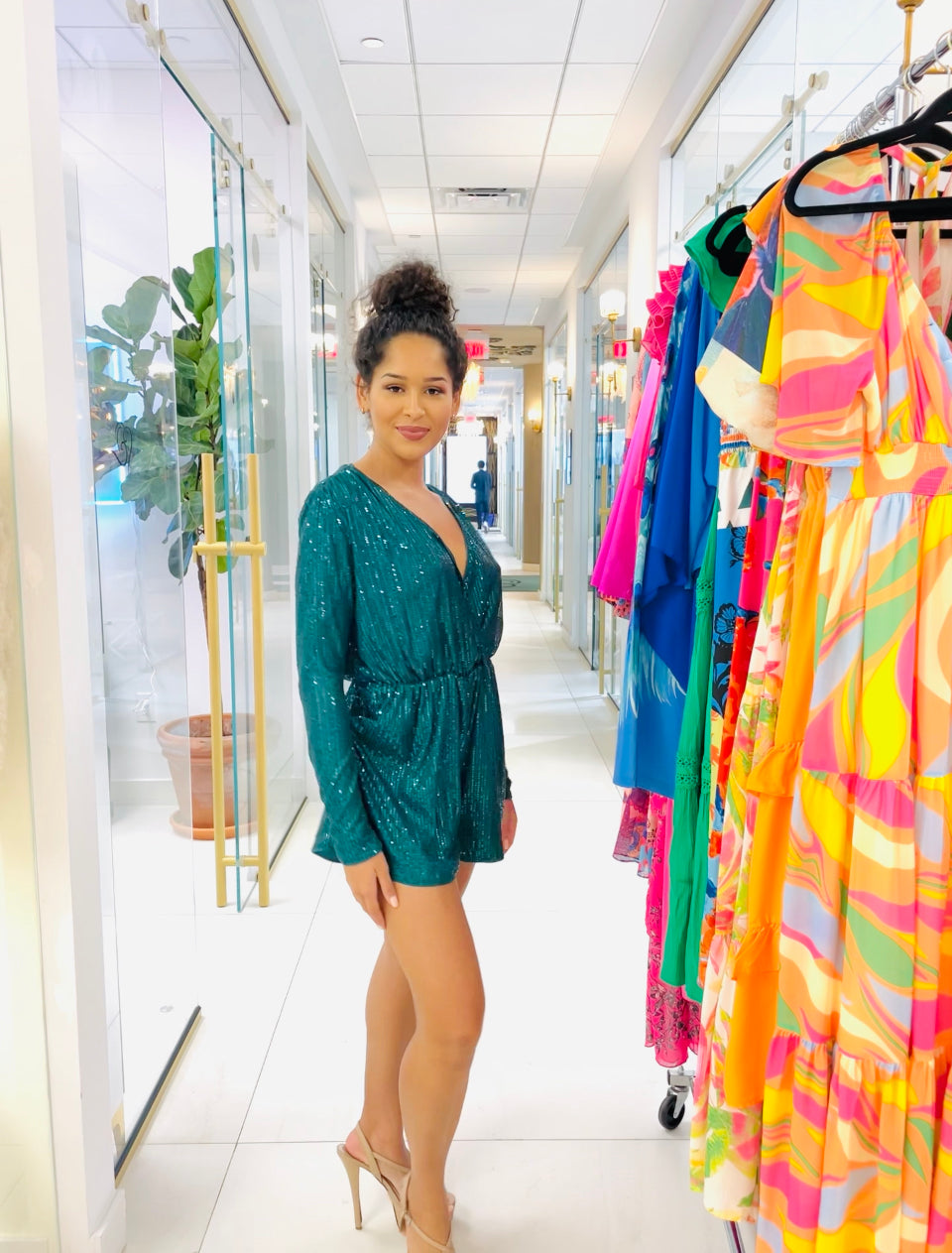 Step out and shine with our Green Sequins Romper, designed to make a bold statement at any event. Its shimmering sequins catch the light from every angle, ensuring you stand out in the crowd. The vibrant green hue exudes confidence and energy, while the playful romper silhouette adds a daring, modern edge. Perfect for nights when you want to dazzle, dance, and express your fearless style effortlessly. Embrace the spotlight and let this piece be your ultimate showstopper.
