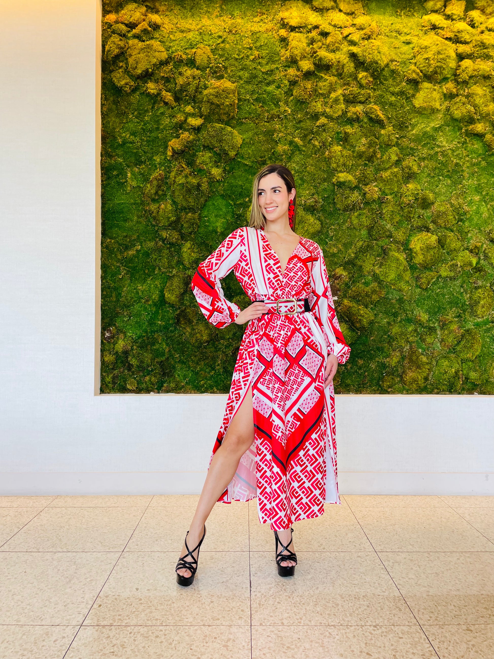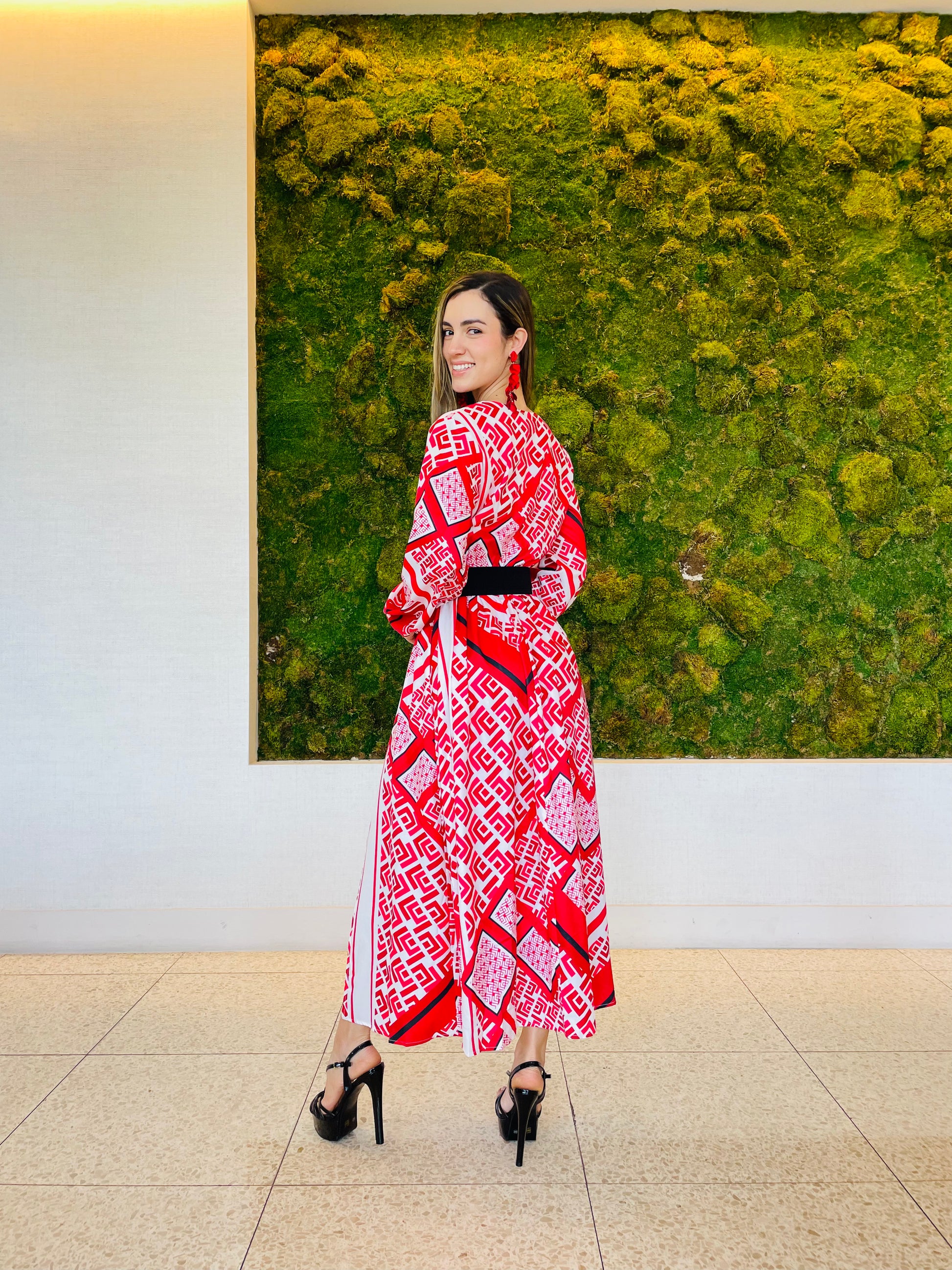 Make a bold statement in the Marina maxi dress, featuring a striking red asymmetrical print that catches the eye from every angle. Designed with two daring front slits, this dress offers both movement and an alluring edge. Perfect for evenings when you want to stand out, its flowing silhouette balances elegance with a touch of fearless style. Embrace confidence and turn heads wherever you go in this show-stopping piece.