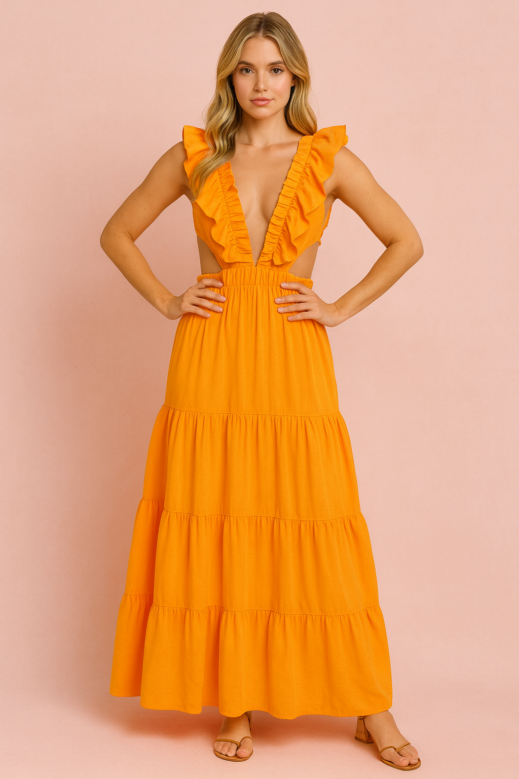 Linen ruffle orange maxi dress with deep V neck, cutout and 2 ruffle seams in the A line skirt.