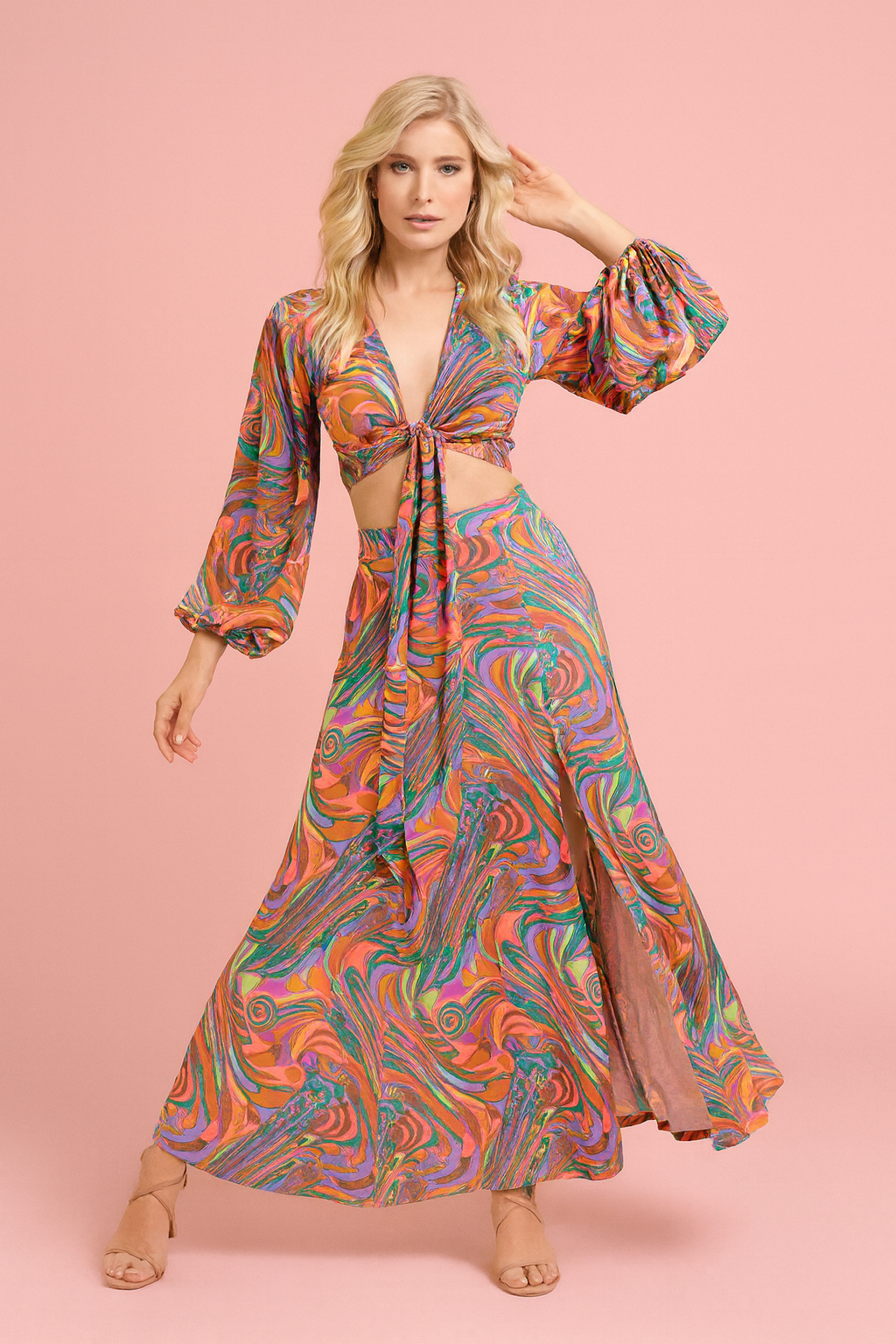 The MIrabelle Midi Skirt features a stunning brown print accented with vibrant specks of orange and lime green, adding a touch of lively elegance to your outfit. Its flattering midi length and thoughtfully placed slit create a graceful silhouette that moves beautifully with you. Perfect for dressing up or down, this skirt pairs effortlessly with the matching MIrabelle crop top (sold separately) to complete a polished, eye-catching ensemble. Embrace bold colors and comfortable style with this versatile piece that will quickly become a favorite in your wardrobe. Elevate your look with the MIrabelle Midi Skirt today.