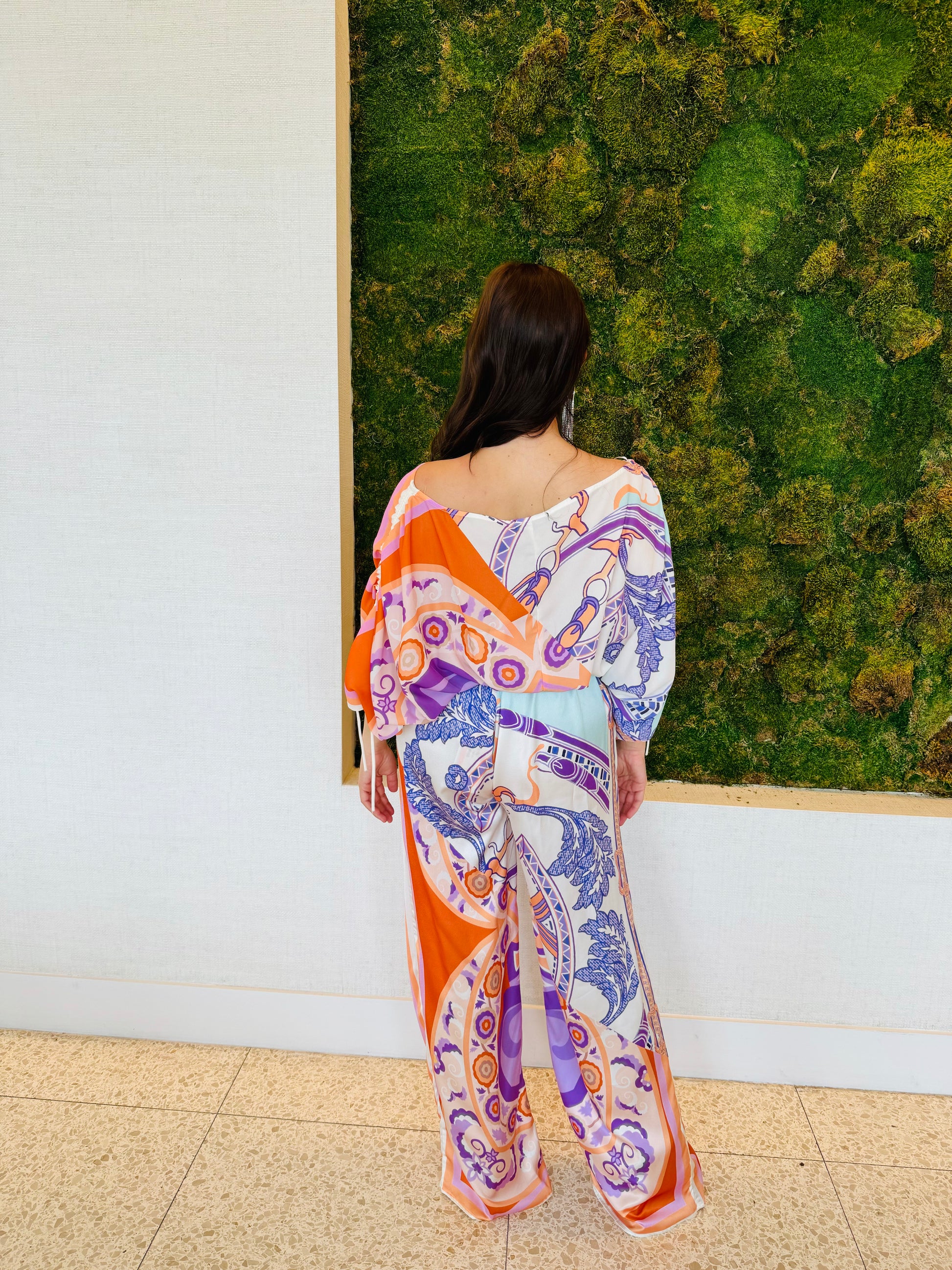 Add a burst of color to your wardrobe with the Zoey purple and orange print blouse. Featuring a captivating blend of rich purple and vibrant orange hues, this blouse brings energy and style to any ensemble. Designed for versatility, it pairs seamlessly with jeans for a casual look or with tailored pants for a polished appearance. Made from soft, breathable fabric, it ensures comfort throughout your day while making a bold fashion statement. Choose the Zoey blouse to express your unique personality with every wear and turn heads wherever you go.